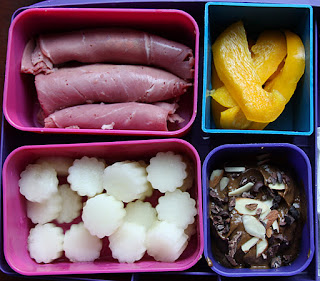 - Involve them, if they want to be involved. This one has absolutely been key for our household. My daughter – who is almost 5 – is greatly interested in making suggestions for her lunchbox, and she always wants a sneak peek before it gets zipped up in its case before we go drop her off at preschool. Here’s how to involve your kids and spouse::: Solicit grocery list and grocery shopping input. Your kids and spouse are more likely to eat lunches made of ingredients they’ve selected themselves. The bonus here is that – if they are skimming grocery ads for produce deals and accompanying you to local markets or farmers – they become more aware of seasonal crops and prices::: Discuss a quick preview before the packing starts. Tell your kids or spouse the night before what you have in mind for the next day’s lunches. If they aren’t up for what you’re planning, you can ask them to survey the fridge and pantry and come up with a healthy plan of their own::: Have them do the packing. You can pre-prep some ingredients or set out some options and help them along the way, but getting your family to put their own effort into packing the lunch helps them to get mentally invested in the process. Keep things age appropriate in the packing process – an adult should slice fruit and veggies ahead for younger kids, for example, but the same younger kids can possibly spoon almond butter into a dip container by themselves.
